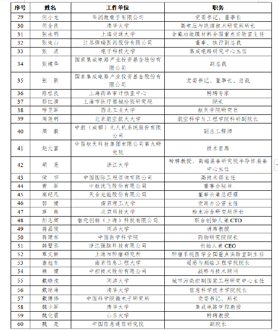 不少上市公司的董事长、高管出现在候选人名单。具体包括,中微公司董事长兼总经理尹志尧、天合光能董事长兼总经理高纪凡、华润微董事长何小龙、恒瑞医药执行副总裁张连山、沪硅产业常务副总裁李炜,以及中控技术实控人、战略与技术顾问褚健等。